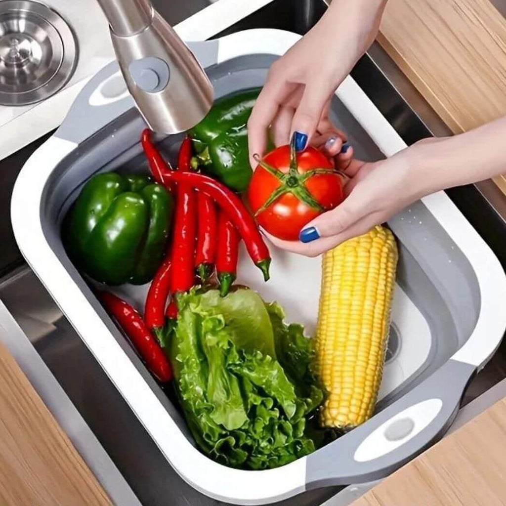 Imagine uma tábua de corte que se transforma em uma bacia drenável para lavar e armazenar alimentos, oferecendo praticidade e inovação que facilitam o seu dia a dia na cozinha.